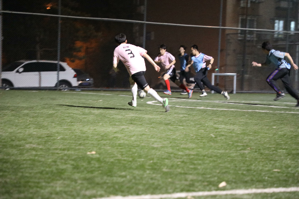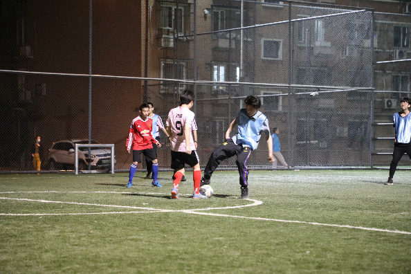 第二场比赛于4月26晚在硕士生队和本科生队中进行。开场2分钟不到,本科生董牧辰在接到队友的一脚长传后,快马加鞭,率先破门。随后研究生队加强中场的拦截和逼抢,曾承实多次抢断,频频传出威胁球,何宇天拉开空挡后接应,轻松破门,这也为他们吹响了反击的号角,随后研究生队在5分钟的时间内接连进球,打出一波进攻高潮。本科生队也不甘示弱,中场球员极具视野的长传,直接连线到前场进攻球员,扳回一城。半场结束,比分已经到了4:3,这是一场快乐足球赛,对攻大战。当天晚上天气凉爽,双方球员跑动积极,比赛到了下半场,气氛依旧十分热烈,双方比分你追我赶,双方队员越战越勇,最终比赛以8:6的比分结束,研究生队获胜。