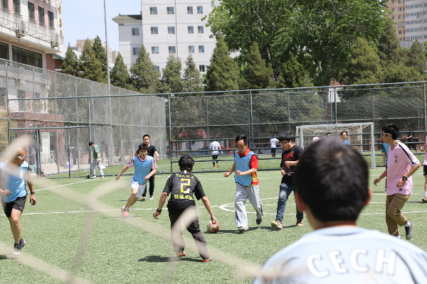 首场比赛的两支队伍分别是教博联队和硕士生队。随着裁判张嘉晨的一声哨响,比赛正式开始。炎热的天气挡不住大家的比赛热情,队员们很快便进入状态,你拼我抢,积极跑动。开场5分钟,倪天佳老师灵活盘带,晃开最后一名防守队员后起脚打门,足球入网,一气呵成。随后教博联队借势继续进攻,朱晓宝老师接边路传中,一脚爆射直挂球门死角。易边再战,硕士生队迅速调整了战术,积极地拼抢和快速地跑动,打出了一波猛烈的反击,硕士生队郭英栋接队友传球,边路切中,一脚漂亮的挑射进球。硕士生队继续保持进攻热度,有两次打到球门柱上,还有几次极具威胁的进攻,场上气氛一度十分激烈,精彩不断。最终比赛以5:2结束,教博联队获胜。