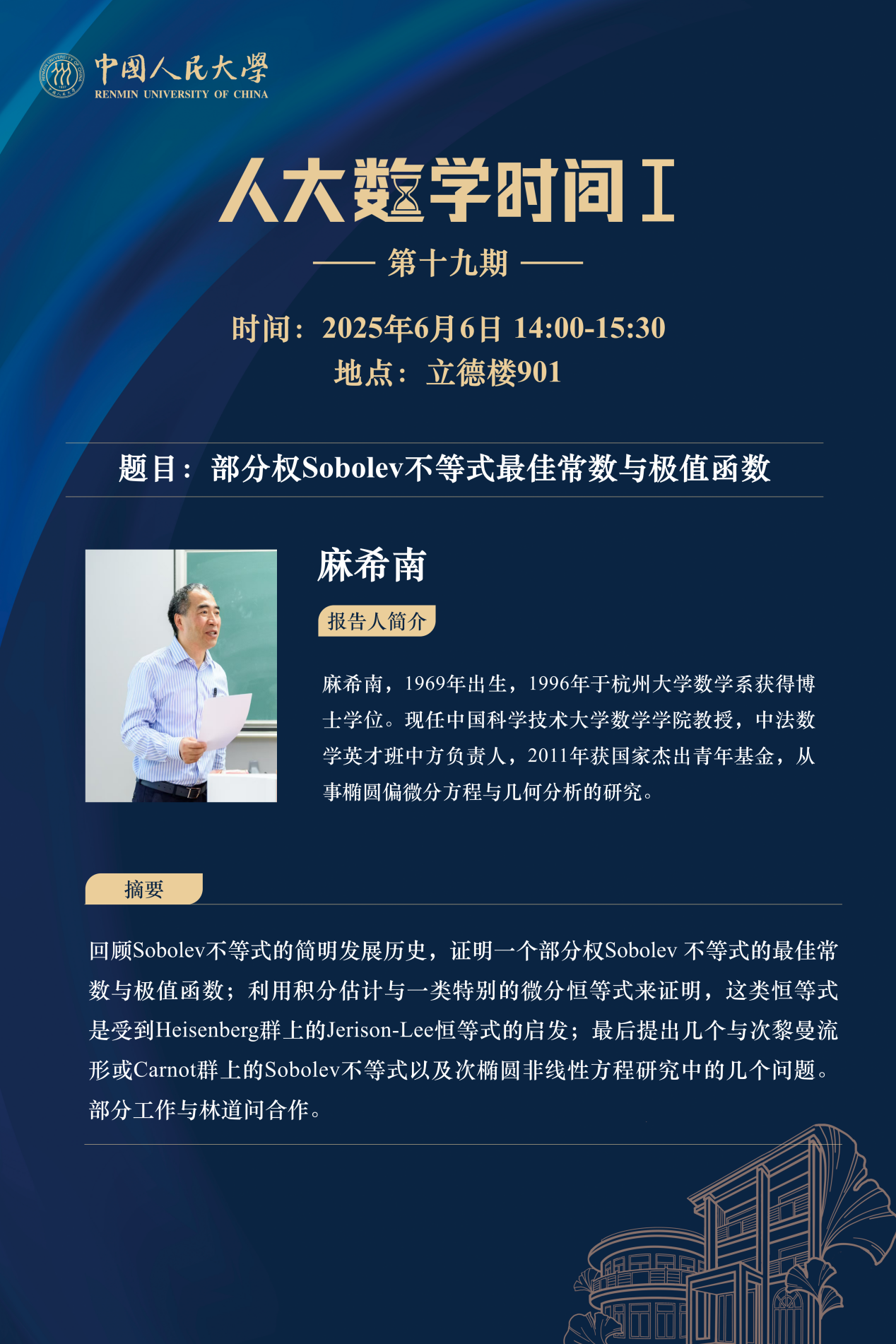 为促进学科交流融合、拓宽师生学术视野、释放科研创新活力,助力人大数学学科走向一流,williamhill官方网站设立“人大数学时间”,以专题研讨、高端学术论坛为载体,搭建数学思想充分碰撞、优秀人才不断涌流、创造活力竞相迸发的舞台。“人大数学时间”将持之以恒,久久为功,立志通过交流与创新、提出重大问题,引领数学学科及相关领域的创新与发展,成为对我国数学发展有贡献意义的平台。以下为“人大数学时间I”第十九期信息: