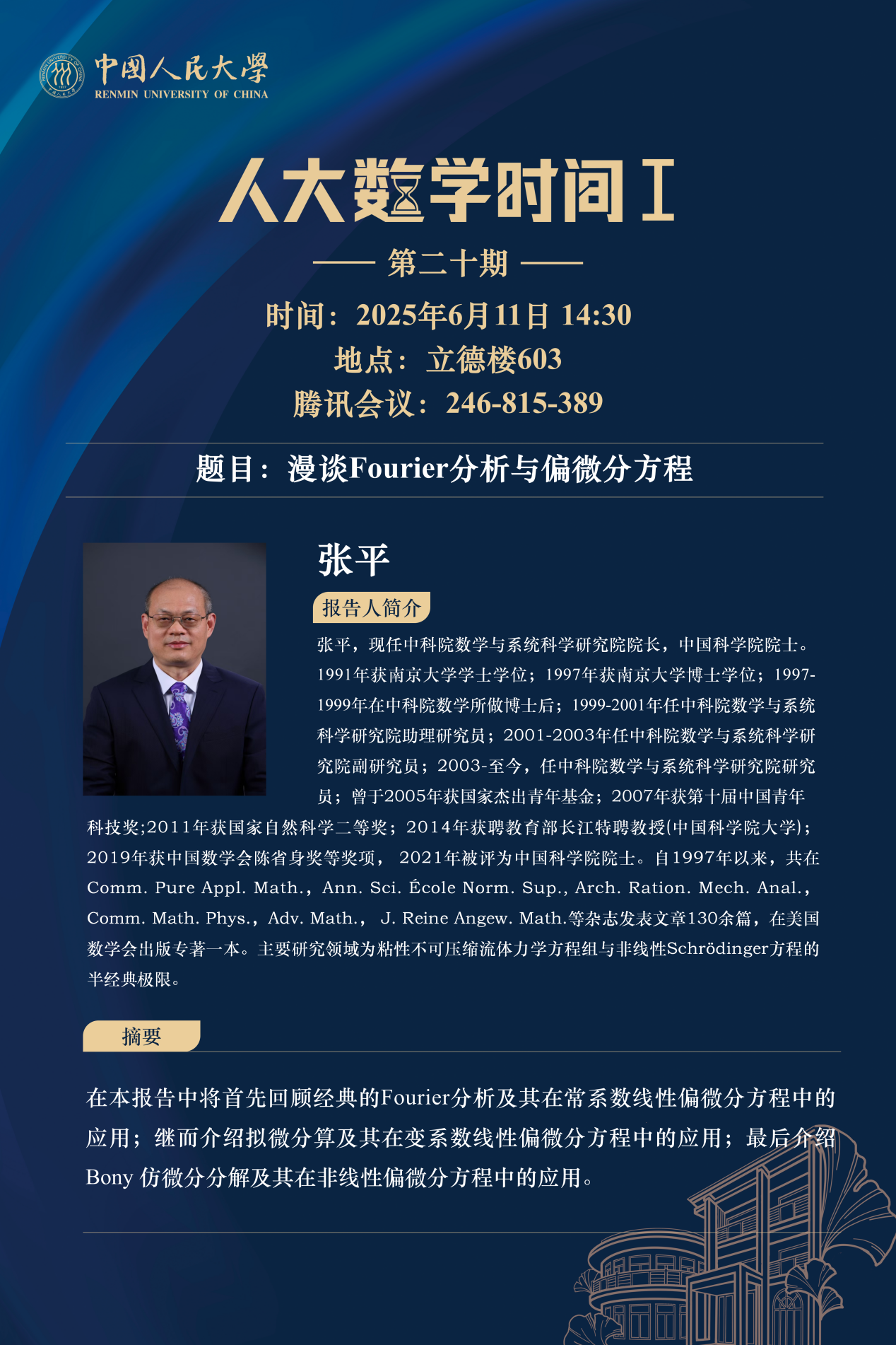 为促进学科交流融合、拓宽师生学术视野、释放科研创新活力,助力人大数学学科走向一流,williamhill官方网站设立“人大数学时间”,以专题研讨、高端学术论坛为载体,搭建数学思想充分碰撞、优秀人才不断涌流、创造活力竞相迸发的舞台。“人大数学时间”将持之以恒,久久为功,立志通过交流与创新、提出重大问题,引领数学学科及相关领域的创新与发展,成为对我国数学发展有贡献意义的平台。以下为“人大数学时间I”第二十期信息:
