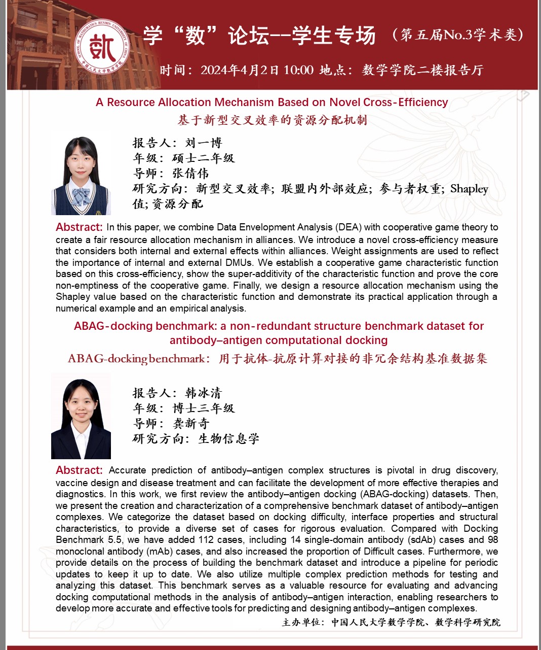 韩冰清同学师从公司龚新奇老师,主要研究方向是生物信息学。本次报告题目为《ABAG-docking benchmark:用于抗体-抗原计算对接的非冗余结构基准数据集