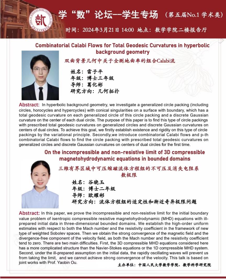 大家好,本届学“数”论坛——员工专场的第一场报告来啦!本场报告类型为学术类,将于2024年3月21日14:00在williamhill英国威廉希尔二楼报告厅举办。主讲嘉宾为博士三年级雷子平同学、博士二年级谷晓玉同学。