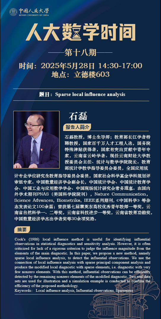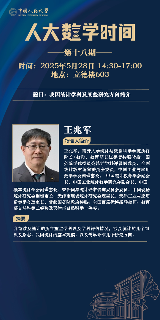为促进学科交流融合、拓宽师生学术视野、释放科研创新活力,助力人大数学学科走向一流,williamhill官方网站设立“人大数学时间”,以专题研讨、高端学术论坛为载体,搭建数学思想充分碰撞、优秀人才不断涌流、创造活力竞相迸发的舞台。“人大数学时间”将持之以恒,久久为功,立志通过交流与创新、提出重大问题,引领数学学科及相关领域的创新与发展,成为对我国数学发展有贡献意义的平台。以下为“人大数学时间I”第十八期信息: