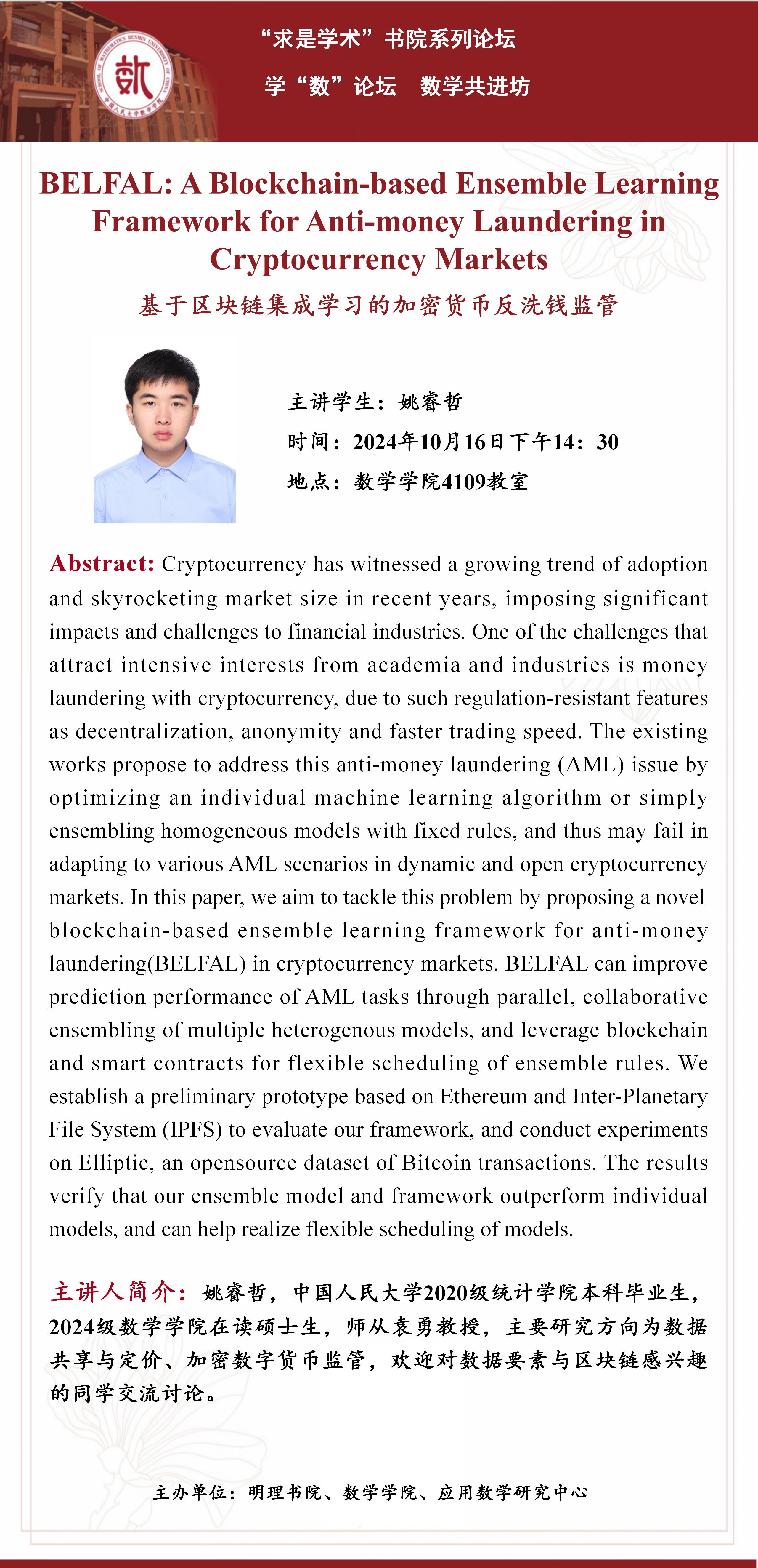 本场报告类型为学术类,将于2024年10月16日(星期三)下午14:30,在williamhill英国威廉希尔4109教室进行,报告主讲人为硕士一年级姚睿哲同学,报告题目为《BELFAL: A Blockchain-based Ensemble Learning Framework for Anti-money Laundering in Cryptocurrency Markets》