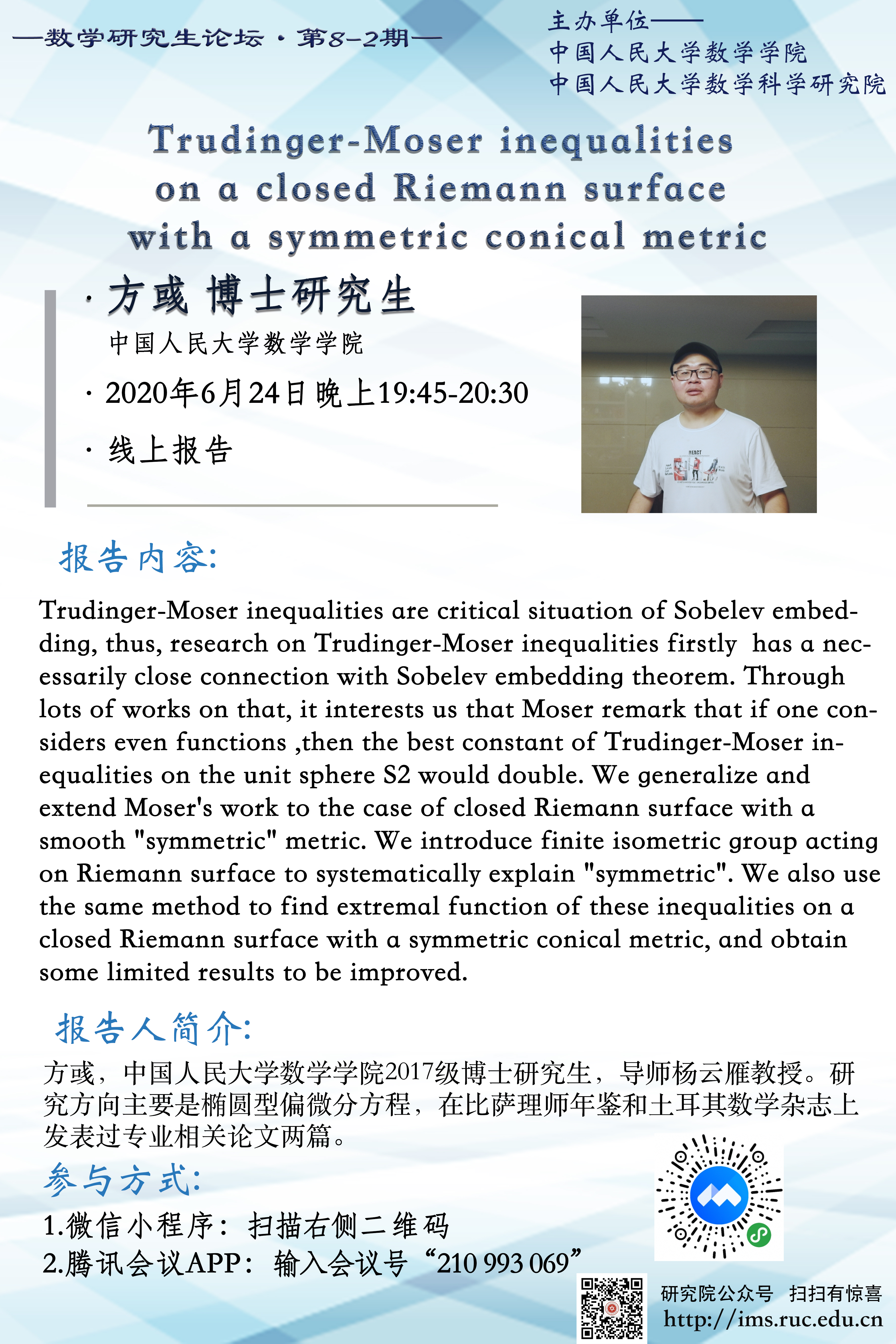 williamhill英国威廉希尔研究生论坛 8-2期—Trudinger-Moser inequalities on a closed Riemann surface with a symmetric conical metric
