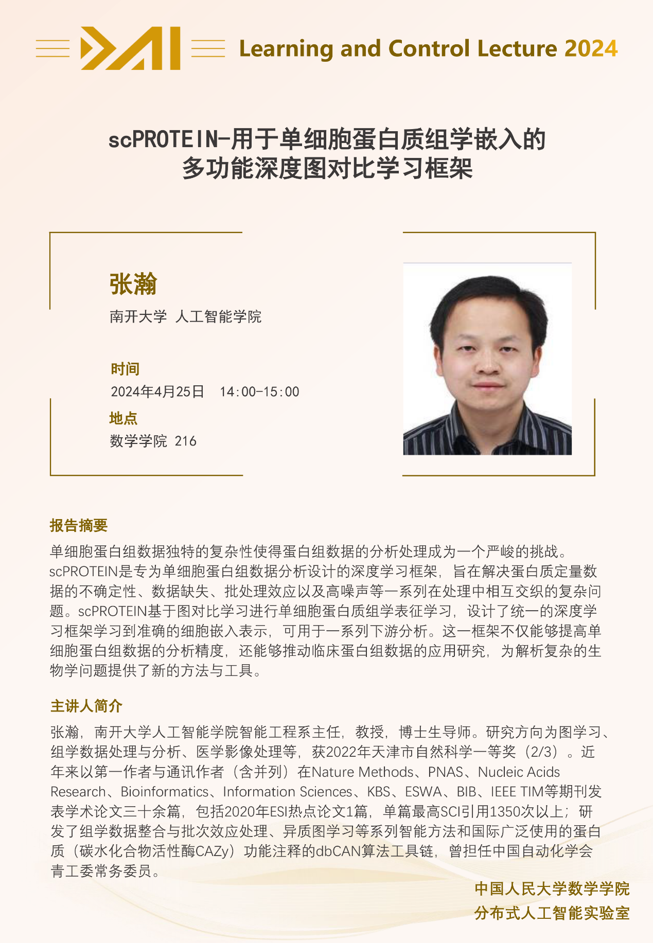张瀚,南开大学人工智能公司智能工程系主任,教授,博士生导师。研究方向为图学习、组学数据处理与分析、医学影像处理等,获2022年天津市自然科学一等奖(2/3)。近年来以第一作者与通讯作者(含并列)在Nature Methods、PNAS、Nucleic Acids Research、Bioinformatics、Information Sciences、KBS、ESWA、BIB、IEEE TIM等期刊发表学术论文三十余篇,包括2020年ESI热点论文1篇,单篇最高SCI引用1350次以上;研发了组学数据整合与批次效应处理、异质图学习等系列智能方法和国际广泛使用的蛋白质(碳水化合物活性酶CAZy)功能注释的dbCAN算法工具链,曾担任中国自动化学会青工委常务委员。