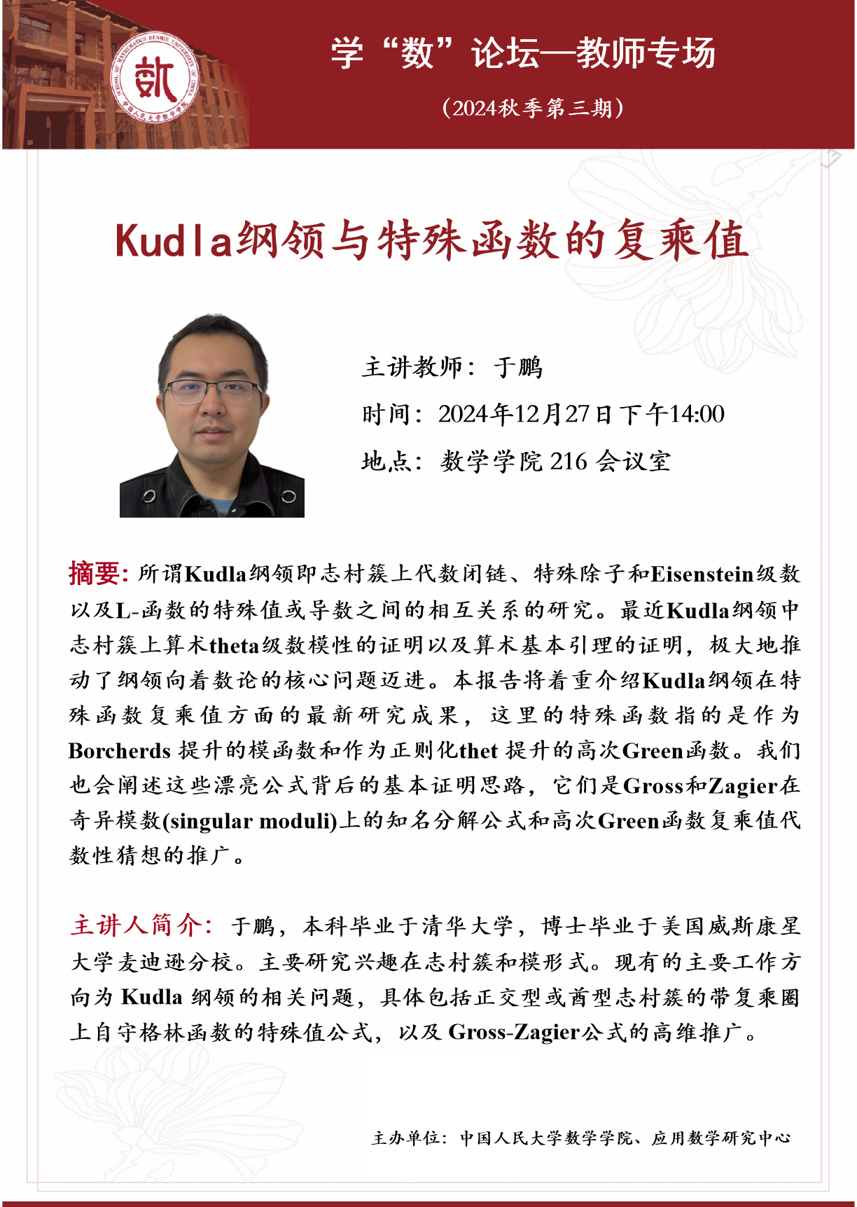 教师专场的第三期报告将于2024年12月27日下午14:00在williamhill英国威廉希尔 216 会议室举行,本场报告的主讲教师为于鹏,报告题目为《Kudla纲领与特殊函数的复乘值》。