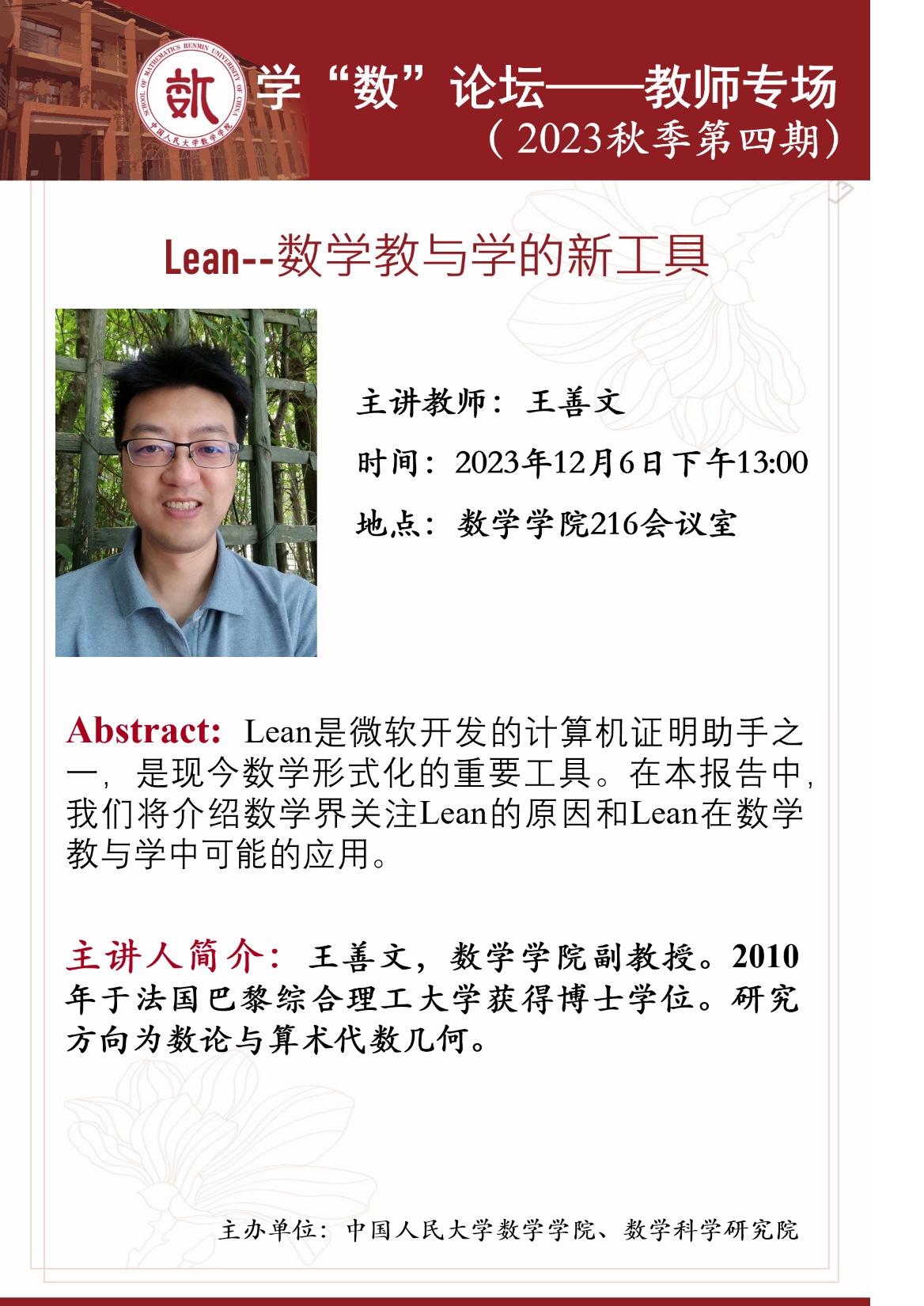 教师专场的第三期报告将于2023年12月6日下午13:00在williamhill英国威廉希尔216会议室举行,本场报告的主讲教师为王善文,报告题目为《Lean--数学教与学的新工具》。
