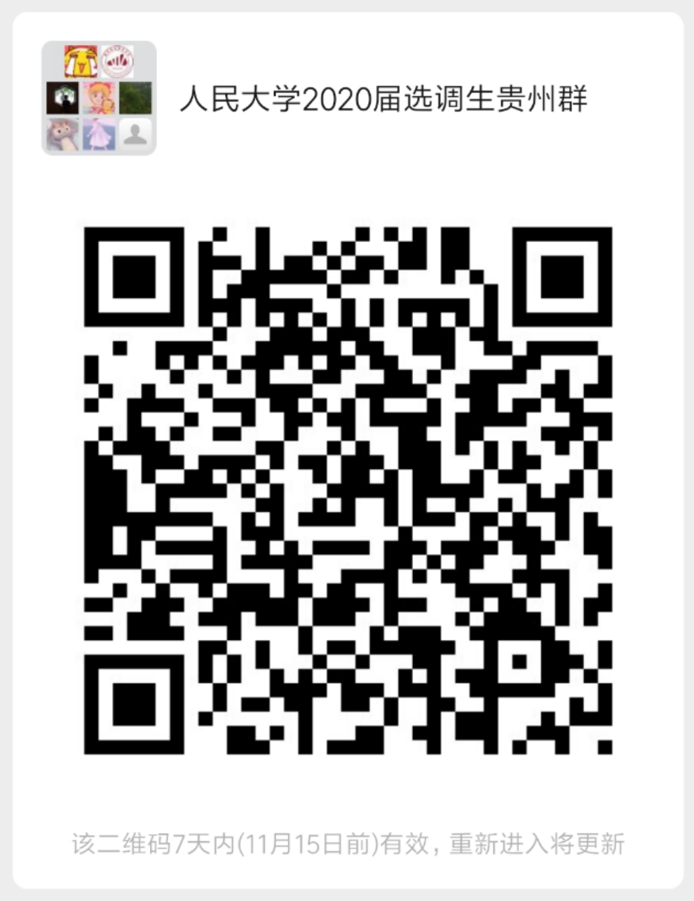 扫码加入“人民大学2020届选调生贵州群”,如群满100人,可加微信:jicengjiuye,验证消息为“姓名+公司+2020届选调生贵州群”
