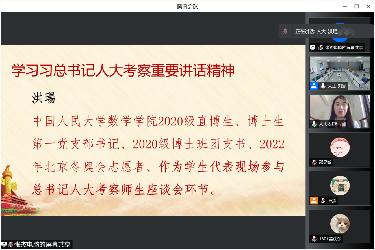 紧接着,作为员工代表现场参加总书记人大考察师生座谈会的洪瑒同学领学了习总书记人大考察讲话重要精神。洪瑒同学表示,我们要用党的历史经验和实践启迪智慧、砥砺品格,自觉听党话跟党走,用脚步丈量祖国大地,用内心感应时代脉搏,将与人民同呼吸共命运的情感贯穿学业全过程。