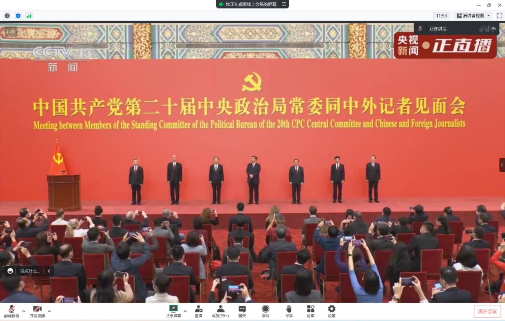 10月23日上午12点,习近平总书记携二十届中共中央政治局常委在京同中外记者见面,并发表了重要讲话。我作为公司理论学习中心组成员,和各位成员以及公司积极份子在公司二层会议室听取了习近平总书记的讲话。
