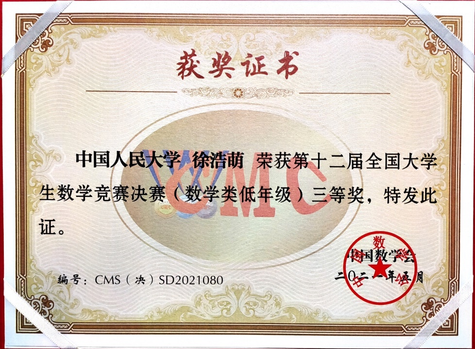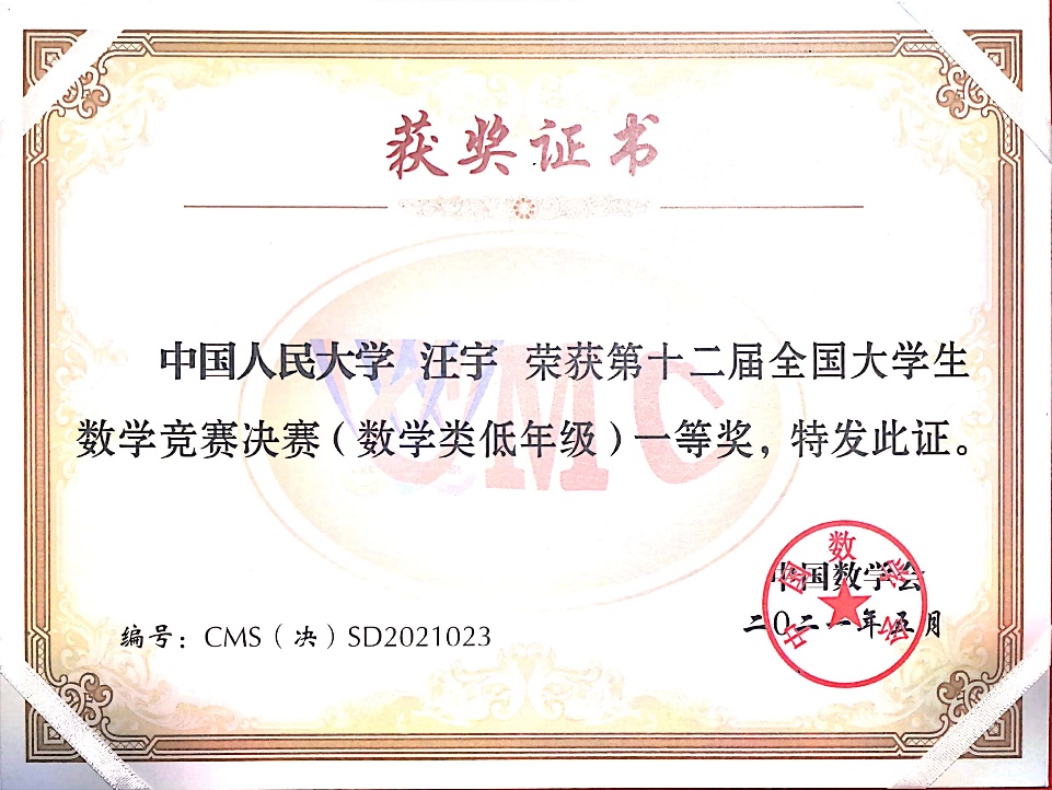 第12届全国老员工数学竞赛决赛于2021年5月16日在吉林大学成功落下帷幕。本次竞赛全国共有32个赛区206921人报名参加初赛,从中选拔出668人进入决赛,实际参赛人数646人,其中,数学专业组343人(高年级组223人,低年级组120人),非数学专业组303人。williamhill英国威廉希尔2019级数学拔尖人才实验班的汪宇同学和徐浩萌同学晋级北京赛区全国总决赛(北京赛区共28名员工入围),并在此次决赛中获得优异成绩,其中汪宇同学获得低年级组全国一等奖(全国共24名同学获得该等级奖),徐浩萌同学获得低年级组全国三等奖(全国共59名同学获得该等级奖)。这是公司第二次组织全校本科生参赛,首次入围全国总决赛并获得优异成绩,这份喜人的成绩必将激励更多公司本科生积极参赛。