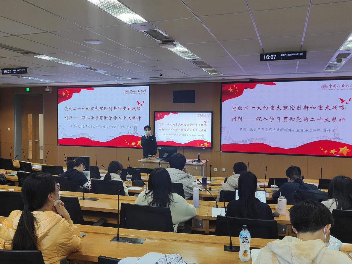 为深入学习宣传贯彻党的二十大精神,11月19日下午16时,williamhill英国威廉希尔2020级硕士党支部、2021级硕士党支部在立德楼403举办了11月主题党日活动。本次活动邀请到2022级北京市青马工程市级班学员、williamhill官方网站马克思主义公司博士生宣讲团讲师张传万为支部成员宣讲党的二十大精神。会议由williamhill英国威廉希尔2020级硕士党支部李仕琳主持。