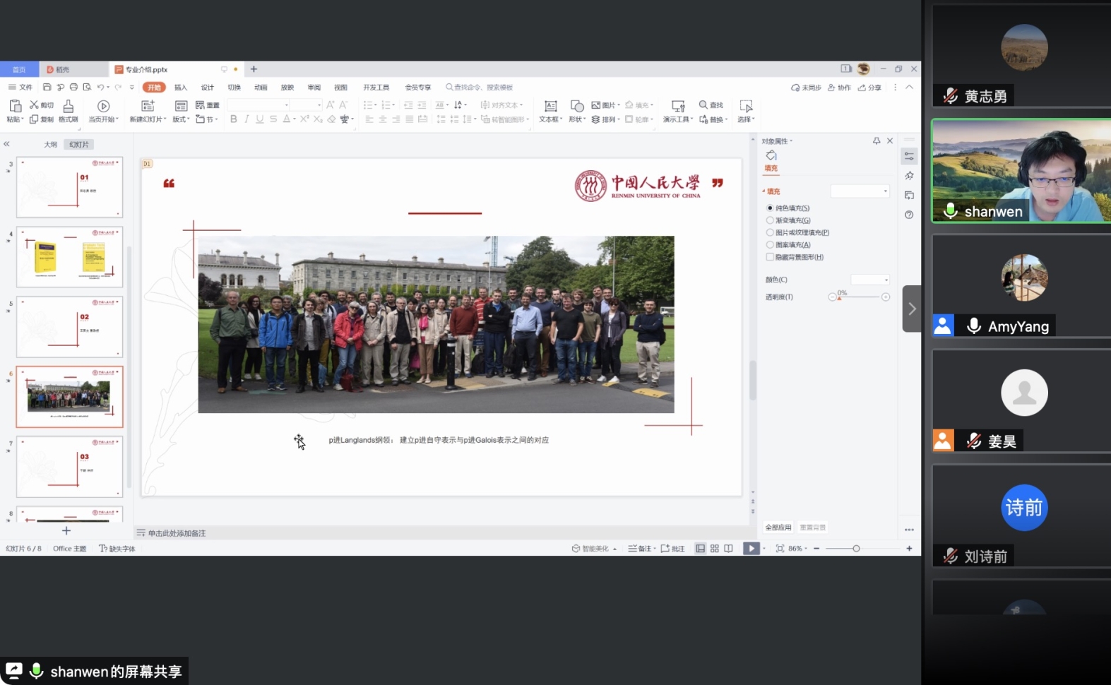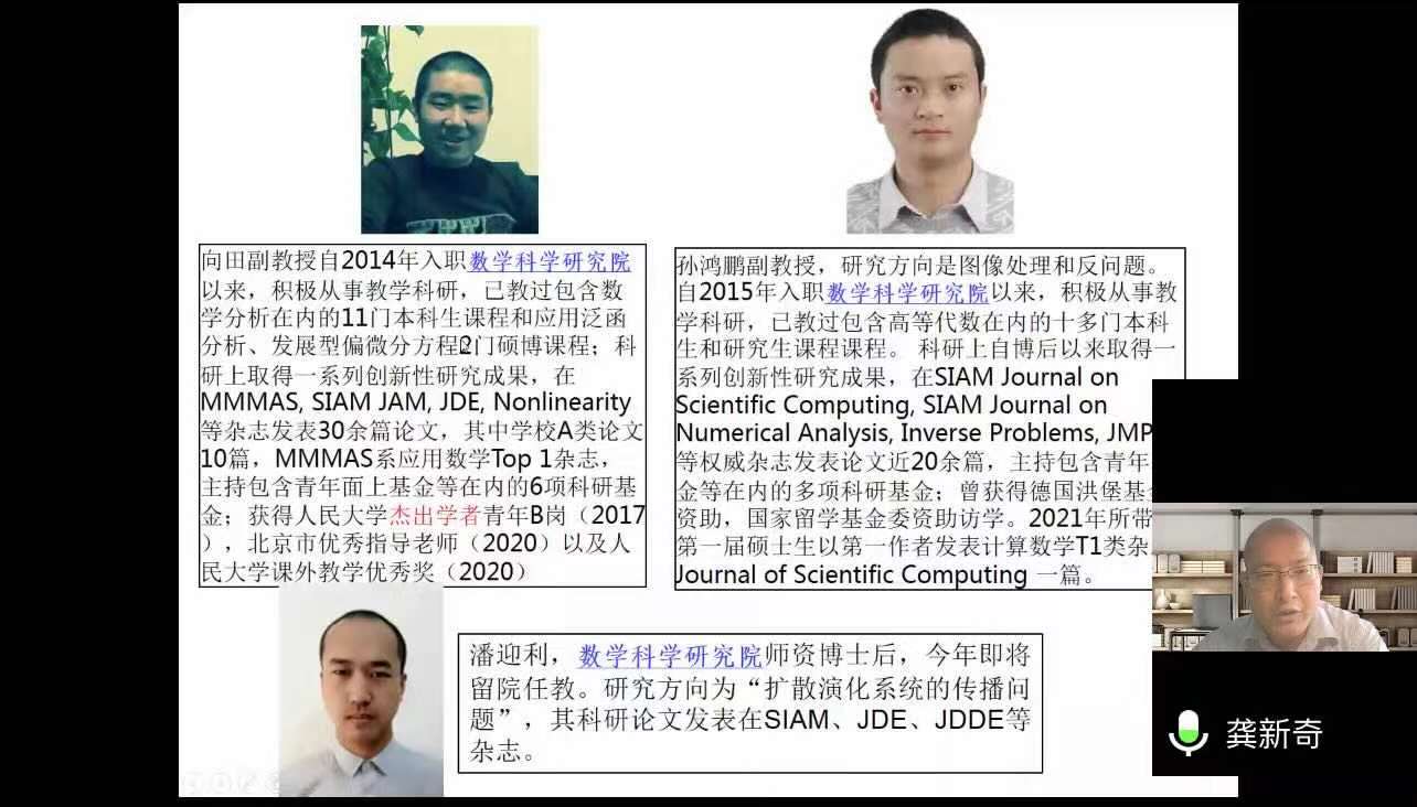 之后,各位老师依次介绍了人大数学学科的研究方向和领域。欧耀彬教授介绍了流体力学方向的相关研究;龚新奇教授介绍了生物数学方向与数学科学研究院的研究团队与研究内容;刘丽光教授针对调和分析方向做了详细介绍;王善文副教授就代数方向分享了独到见解并鼓励同学们努力做一名终身学习者;郑涛副教授介绍了复几何和复流形方向的研究进展;杨云雁教授期待大家能够在偏微分方程方向上快速进入状态并做出贡献;张庆彩教授介绍了以黎曼猜想为代表的复变函数方向;王伟教授就控制论方向做出了精彩的阐述,欢迎同学们加入williamhill英国威廉希尔共同探索数学的魅力。